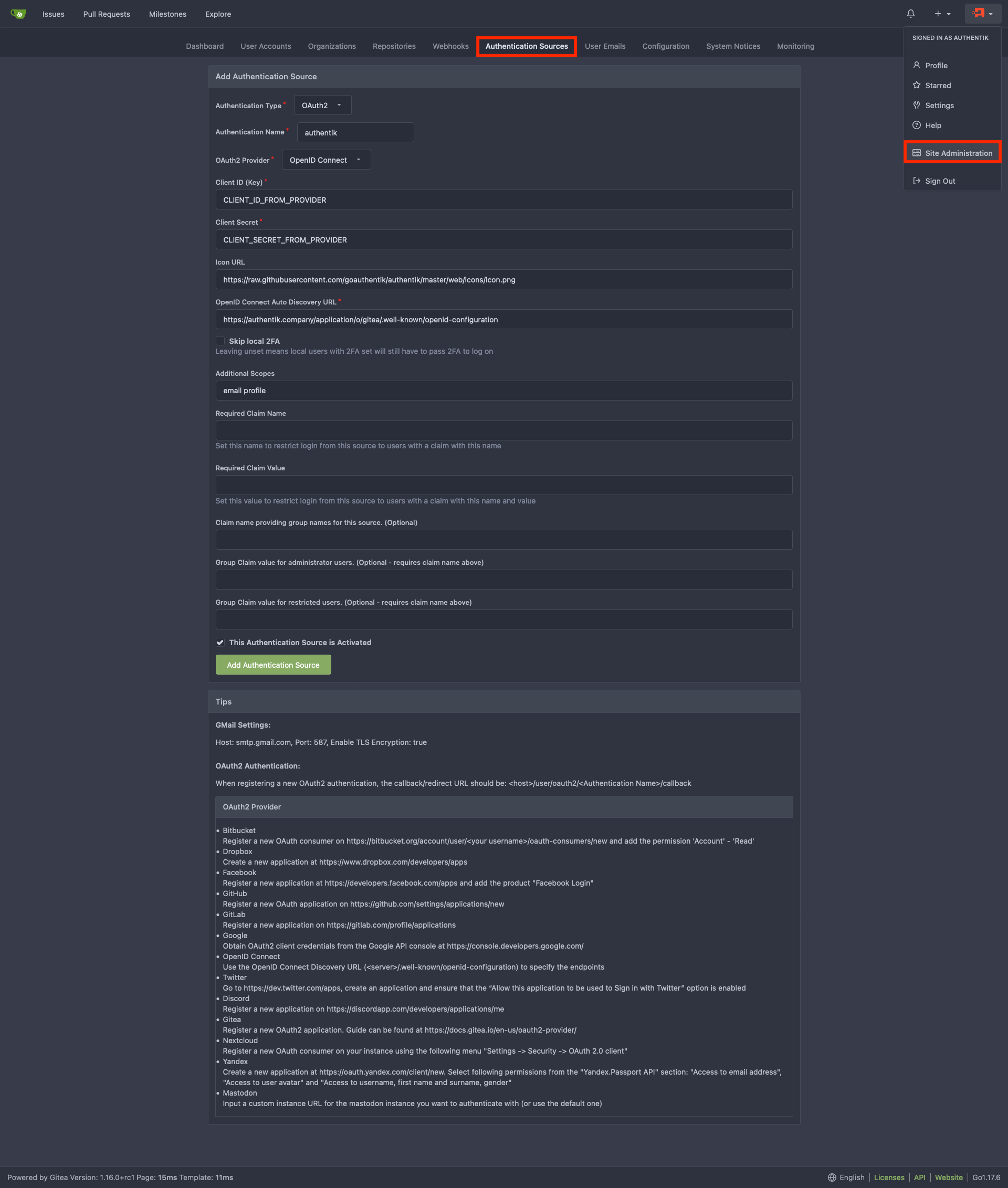 Navigate to the Authentication Sources page at https://gitea.company/admin/auths and edit the authentik Authentication Source.